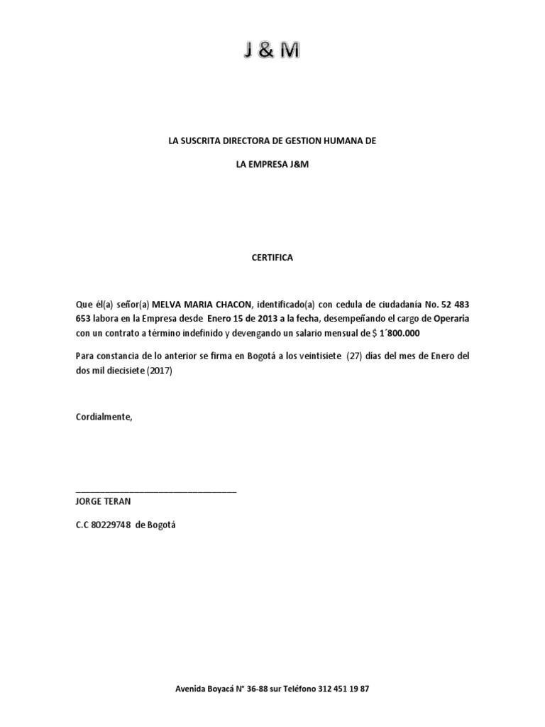 La carta laboral es entonces un documento que valida la pertenencia de un empleado a una empresa o centro de trabajo cualquiera. Por ejemplo, si escribes una carta para pedir informes sobre un trabajo o una pasantía que se ofrece por ejemplo, supongamos que vas a escribir una carta en español para postular a una pasantía. Para redactar una carta de este tipo puedes seguir las siguientes recomendaciones. Una carta laboral, también conocida como constancia laboral, es aquella que una empresa emite a los efectos de hacer constar que una determinada persona o empresa, ha desempeñado un o varios servicios en la empresa que emitió la carta. De igual forma, con este documento se comprueba la prestación de servicios laborales de un trabajador. A continuación, se muestran algunos consejos sobre cómo escribir una carta de recomendación laboral, así como un ejemplo de una carta de recomendación para un antiguo empleado. Fallece un buceador profesional mientras trabajaba en via 7tvregiondemurcia.es. Por medio de la presente informo que el c. Quiero aprovechar esta carta para agradecerle la confianza depositada en mí al inicio de nuestra relación laboral y durante los (número) años que he formado. Una carta laboral es un tipo específico de carta formal. Constituye un requisito fundamental en los procesos de entrevistas laborales, sirve para destacar las virtudes personales y. Debe estar escrita con coherencia, organización y claridad, y debería estar escrita en un lenguaje apropiado y conciso, con una actitud cortés o amable, y corrección. 589.258.999 labora en la empresa desde julio 25 de 1917 a la fecha.